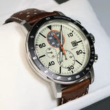 MATERIAL : Brown leather strap with stainless steel case and blue dial, luminous indicators and aluminum bezel. Mineral crystal.