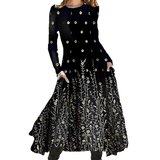Features: Round neck, long sleeves, high waist, floral print, flowy hem and swing dress.