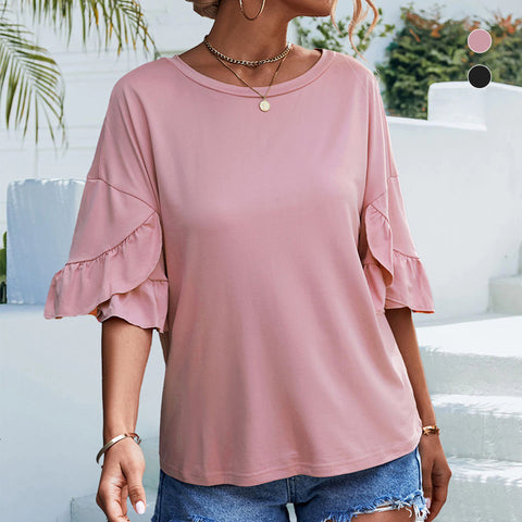 Women's Ruffled Half Sleeve Top Solid Color Crew Neck T-shirt