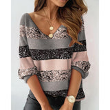Women's Colorblock Striped Print Casual V-Neck T-Shirt