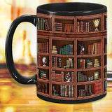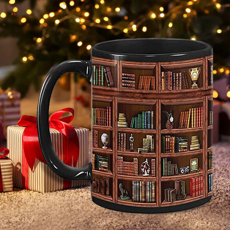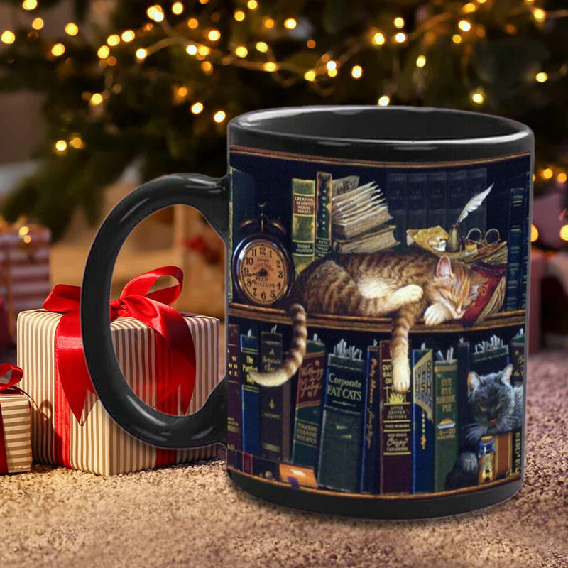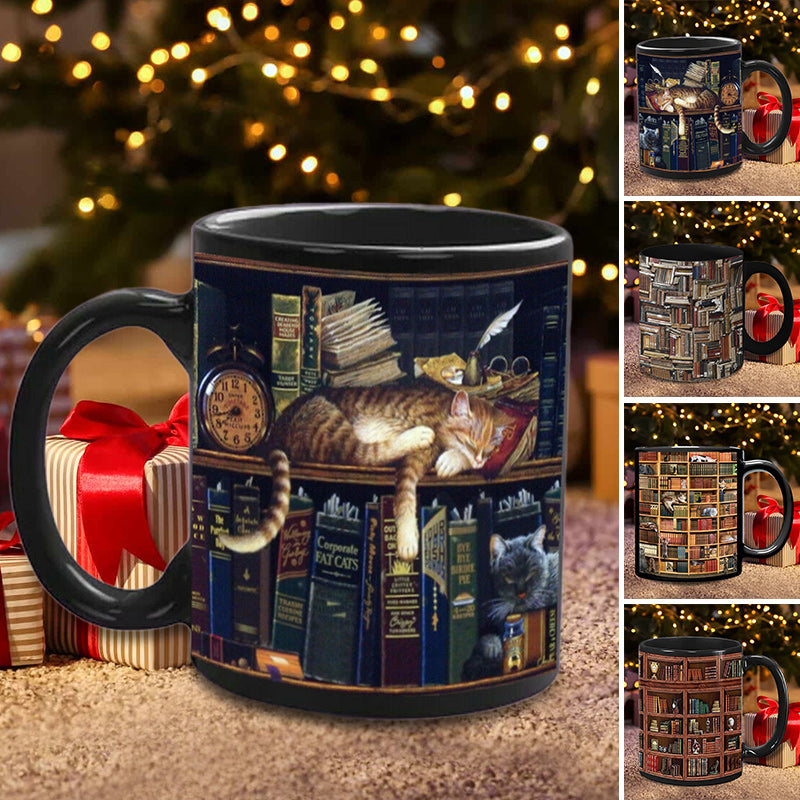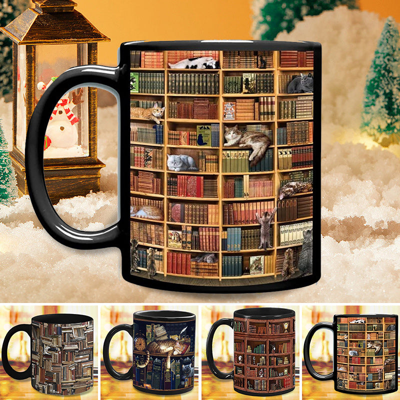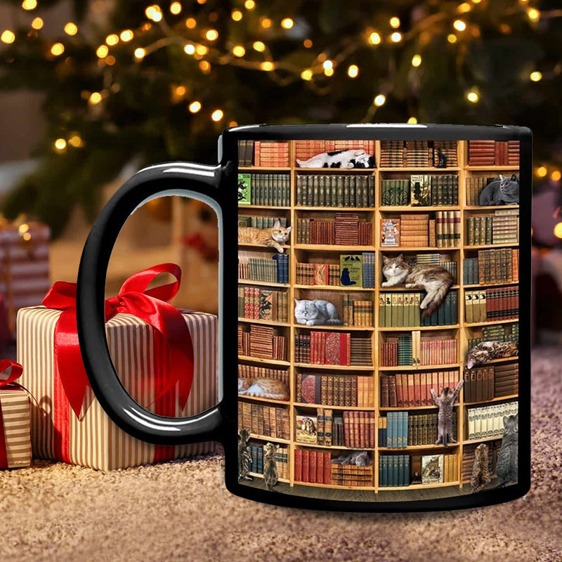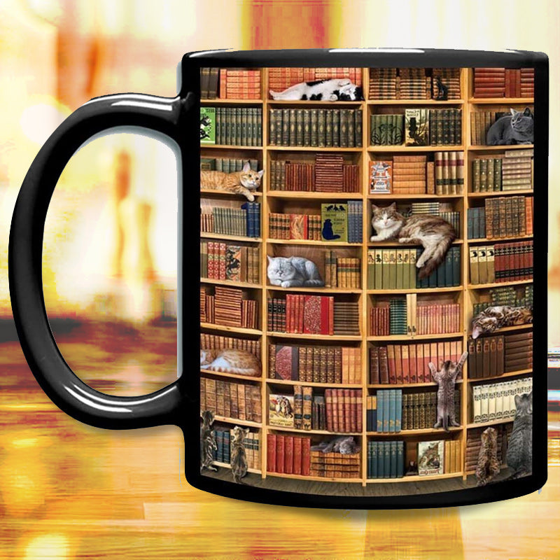 Coffee lovers gift ideas: The pattern of a bookshelf and cats brings an interesting and unique look to the cat coffee mug. It creates a literary space, evoking curiosity and a passion for books. In particular, the presence of the cats adds a playful and adorable element.