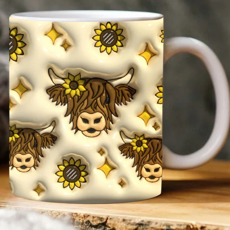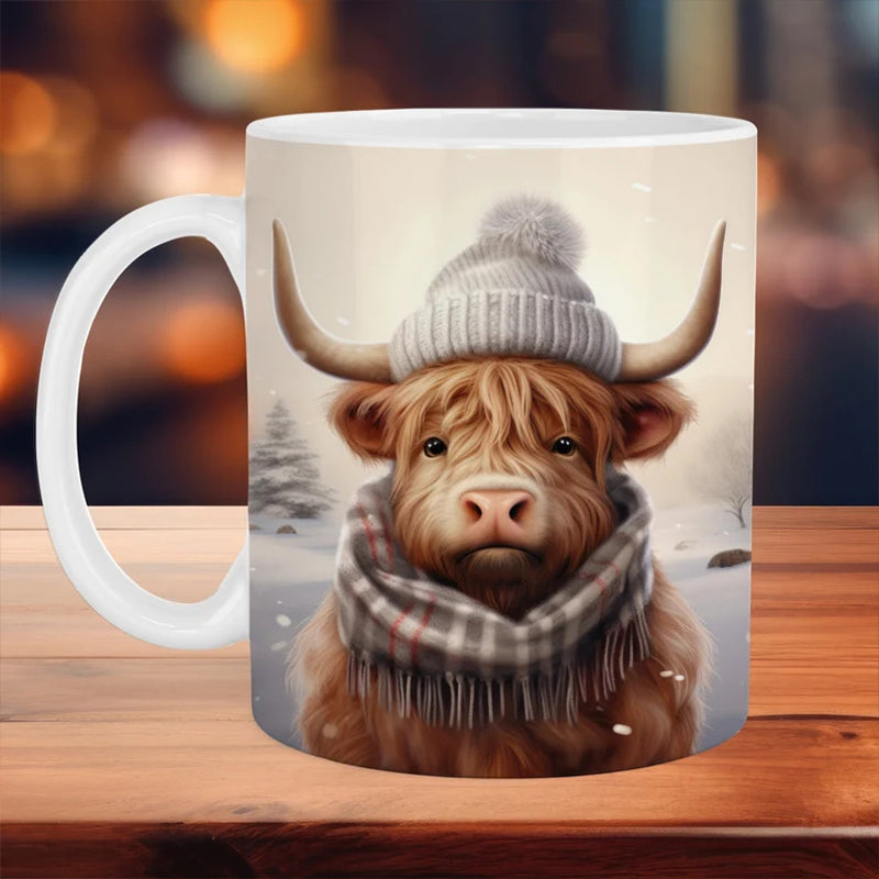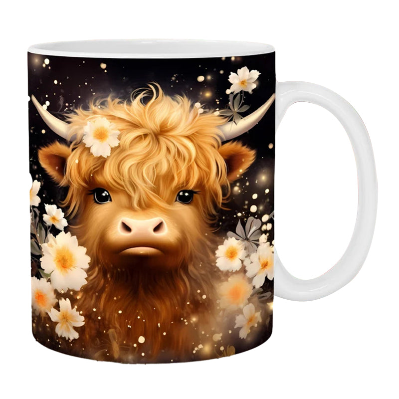 Highland Cow Theme Design: this mug features a highland cow theme, with various highland cows meticulously depicted on the body of the mug, presenting either majestic or cute images. It is a unique and interesting mug for a distinctive coffee or tea enjoyment.