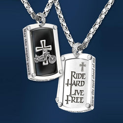 Superbly handcrafted in tough-as-a-biker stainless steel, this striking bikers necklace features a sculpted custom bike and cross icon against a jet black ion-plated background. Adding to its special meaning, this keepsake is engraved on the back with a cross and biker's motto "RIDE HARD LIVE FREE," while etched on the sides are words from the powerful "Biker's Blessing" poem. Strong demand is expected, so don't wait. Order now!