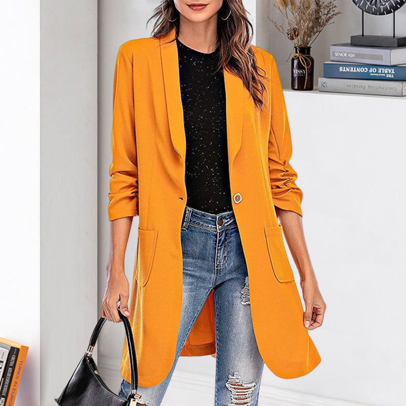 Features: Classic women's blazer, lapel collar, front placket, one button, long sleeves, pleated details, solid color, shoulder pads, split women's casual jacket with two functional flap pockets.