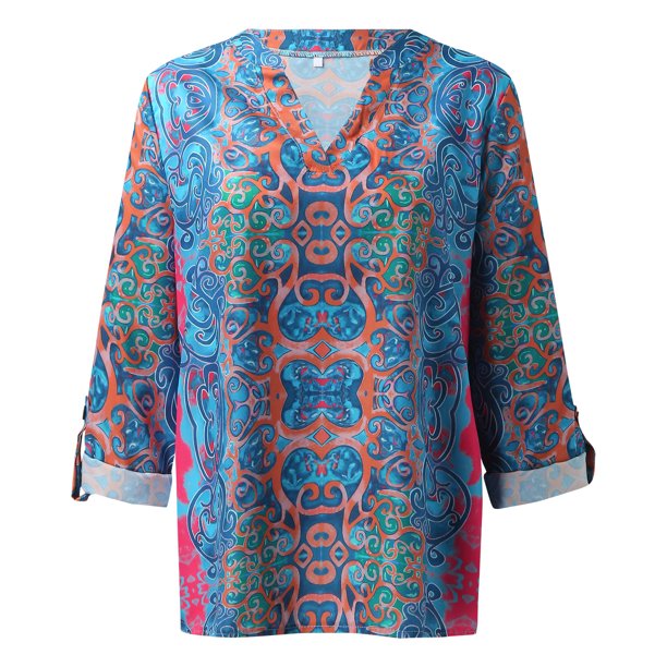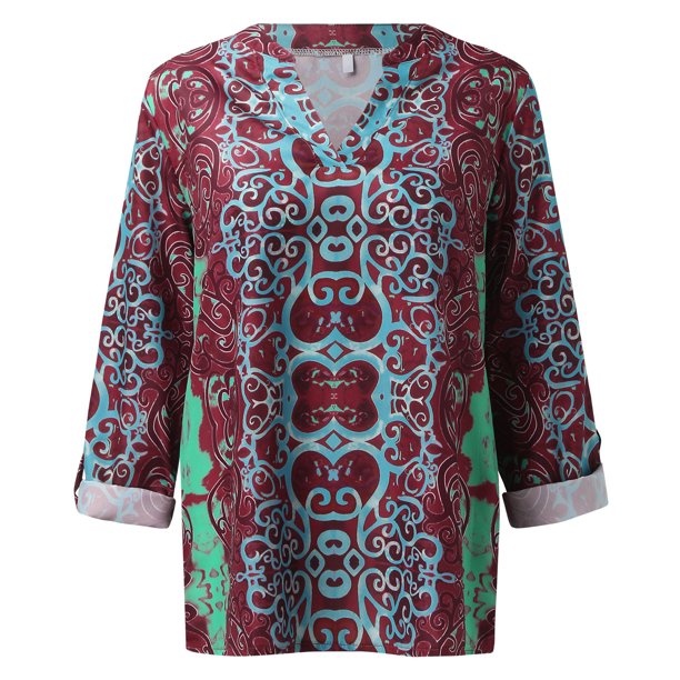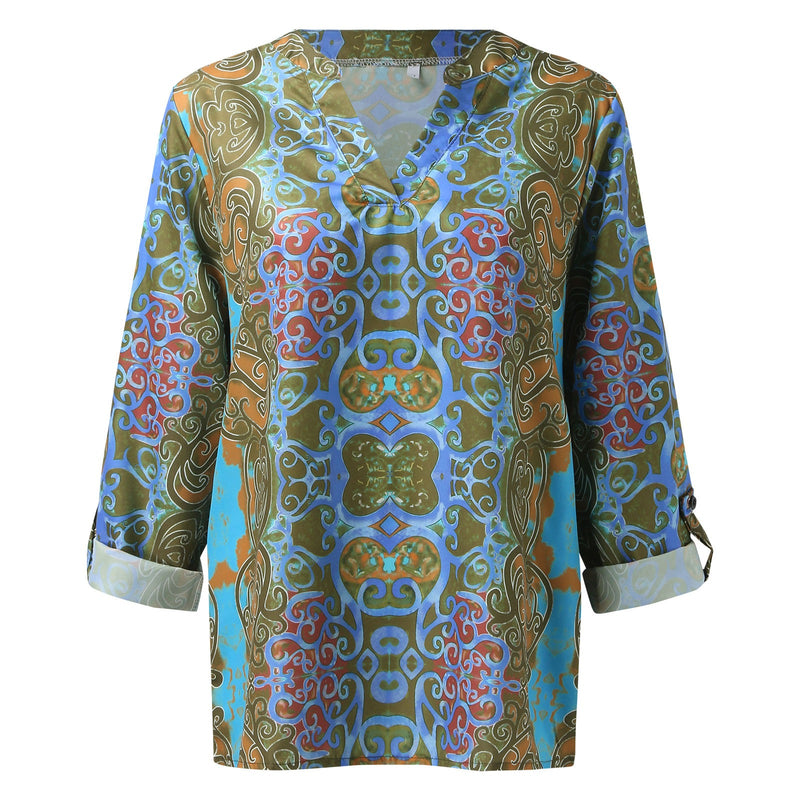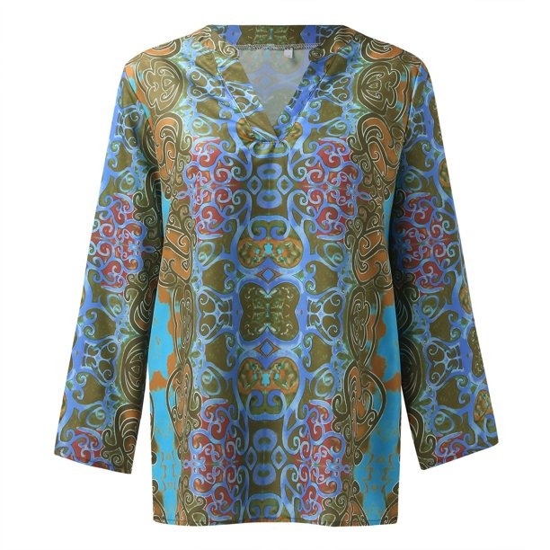 Women's Casual Boho Print V Neck Long Sleeve T-Shirt
